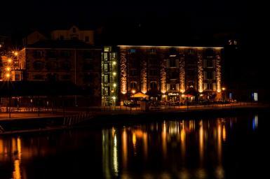 Keywords: building restaurant patio lake water night dark lights