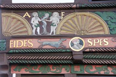 Keywords: building truss home fachwerkhaus carving adam and eve religion fig facade figurine font sun bar decor