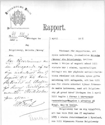 Keywords: Bukharin swedish police document.jpg ru Рапо т стокгольской полиции N99 от 3 ап еля 1916 об а есте ойши Абы Долголевского иколая Буха ина Х Бьё кег ен Скандинавский т анзит Российские еволюционе ы в Скандинавии 1906 1917 Стокгольмская полиция 1916-04-03 PD-old Nikolai Bukharin |