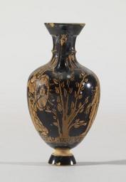 | Keywords: Bulas Group - Miniature Panathenaic Amphora - Walters 4859 - Left.jpg This amphora with a flaring offset mouth depicts Poseidon and Athena on one side and Hermes on the other Poseidon stands in profile to the right with his left foot propped up on a rock and his left arm bent and resting on his left knee In his right hand he holds a trident upright which extends into the ornament above A mantle is draped around his back right thigh and over his left leg Athena stands to the left holding a spear upright in her right hand and she has a shield with a Gorgoneion and a star device on her left arm She wears a peplos girded at the waist necklace bracelet and Attic helmet Hermes is depicted standing to the left He holds a kerykeion in his right hand at waist level and wears a pestasos chlamys and mask Behind him is a stele on which his left arm rests while to the left and right are olive trees which fill the areas underneath the handles The subject matter is not the usual for Panathenaic amphorae which normally have Athena on one side and athletes on the other Poseidon and Athena are here depicted calmly standing and facing one another on the front a juxtaposition which brings to mind their contest for the city of Athens This story is first known to have been depicted in the west pediment of the Parthenon but there is no sign of strife in our scene If Hermes wears a mask as the black line running from his chin up suggests the scene may in some way have been influenced by a dramatic performance The generally poor quality of drawing however makes it impossible to determine if the painter meant to indicate a mask or not The olive trees beneath the handles are approporiate fillers because of the tree's association with Athena the story of the contest Panathenaic ampohorae and the Panathenaia early 4th century BC Classical terracotta cm 8 8 4 6 h x max diam ; at rim cm 2 55 diam ; at foot cm 1 8 diam accession number 48 59 13939 Don Marcello Massarenti Collection Rome 1897 cat no 153 Henry Walters city Baltimore Walters Art Museum Henry Walters Acquired by Henry Walters with the Massarenti Collection 1902 Goddess and Polis The Panathenaic Festival in Ancient Athens Hood Museum of Art Hanover; Tampa Museum of Art Tampa; Virginia Museum of Fine Arts Richmond; Princeton University Art Museum Princeton 1992-1993 place of origin Greece Walters Art Museum license Ancient Greek red-figure pottery in the Walters Art Museum Miniature Panathenaic amphoras Media contributed by the Walters Art Museum needs category review Bulas Group |