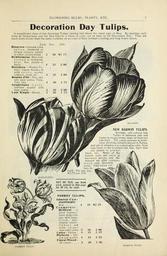 | Keywords: Bulbs and plants (15768356053).jpg FLOWERING BULBS PLANTS ETC <br> 1 75 <br> Decoration Day Tulips <br> A magnificent class of late flowering Tulips coming into bloom the latter part of May By planting such <br> sorts as Gesneriana and the New Darwin a blaze of color can be kept up till Decoration Day They are <br> much more showy than the early varieties on account of their brilliant coloring and long flower stems <br> Each <br> Bizarres Ground color <br> yellow feathered or <br> striped crimson purple <br> or white choice mixed 3 <br> By bloemens Blotched <br> striped or feathered <br> blue liiac purple or <br> black 4 <br> Breeders i Mother Tu- <br> lips Large flowers of <br> solid colors scarlet <br> crimson violet etc 4 <br> Bouton d'Or The only <br> late pure yellow Tulip <br> Very fine 4 <br> Gesneriana Large <br> brilliant scarlet with <br> blue center 3 <br> Late Single Mixed 3 <br> ZARKE <br> V DARWIN TULIPS <br> lliant self-colored late <br> Tulips of immense size and <br> borne on strong stems many of them two <br> feet high The colors surpass in brilli- <br> ancy anything hitherto known in Tulips <br> and are of almost every conceivable color from <br> pale blush to the brightest red lilac light blue <br> and purple to almost <br> black etc Many of the <br> named sorts are sold at <br> enormous prices and the <br> mixture we offer contains <br> many very desirable <br> sorts Fine mixed col- <br> lors 4c --- ~~ <br> each 40c per doz <br> 2 75 per 100 <br> BYBLOE \\EN <br> SET OF TEN one Bulb <br> each named on this page <br> for 30 cts by mail <br> PARROT TULIPS <br> Admiral Con- <br> stantinople- <br> Red 4 <br> Cr a mo i sie <br> Brilliant A <br> great improve- <br> ment deepcrim- <br> son with large <br> black star- <br> shaped center <br> flowers and <br> bulbs larger <br> than other sorts 5 <br> Lutea Yellow 4 <br> Perfecta - Yel- <br> low and scarlet 4 <br> Finest Mixed- <br> All colors 3 <br> PARROT TULIP <br> DA WW IN TULIP 42214137 133055 65937 Page 7 Text http //www biodiversitylibrary org/page/42214137 1908 10 5962/bhl title 65937 Currie Brothers Company ; Henry G Gilbert Nursery and Seed Trade Catalog Collection Biodiversity Heritage Library Currie Bros Co Bulbs and plants autumn 1901 Garden Stories Bulbs Plants Catalogs Flowers Nurseries Horticulture Plants Ornamental Seeds U S Department of Agriculture National Agricultural Library bhl page 42214137 dc identifier http //biodiversitylibrary org/page/42214137 bhlGardenStories BHLinbloom bulbs plants nurseries horticulture plants ornamental u s department of agriculture national agricultural library bhlgardenstories bhlinbloom Information field Flickr posted date ISOdate 2015-01-28 Check categories 2015 August 24 CC-BY-2 0 BioDivLibrary https //flickr com/photos/61021753 N02/15768356053 2015-08-24 07 54 27 cc-by-2 0 PD-old-70-1923 Currie Bros catalogs Photos uploaded from Flickr by FĂŚ using a script |