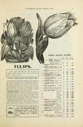| Keywords: Bulbs and plants (16202134999).jpg FLOWERING BULBS PLANTS ETC <br> TULIPS <br> Doz <br> 25 <br> 100 <br> 1 50 <br> 30 <br> 1 75 <br> 25 <br> 1 50 <br> If by mail add 40c per 100 to price ; <br> single bulbs and by the do en delivered <br> free at prices given <br> 75 6 00 <br> 3 sold at dozen rates 25 at 100 rates <br> For making a handsome display in the garden in <br> the early spring - before we even dare plant our sum- <br> mer flowering- plants there is nothing so effective <br> nor none so reliable as the Tulip It may also be <br> successfully erown in pots for the house or green- <br> house and when so grown is treated about the same <br> as the Hyacinth Nothing can be more handsome <br> than a good-sized pot with several bulbs of various <br> varieties of these in it and in full bloom <br> Garden Culture Any good soil well enriched <br> will suit these bulbs October or early in November <br> is the proper time to plant them Set them four or <br> five inches apart and about three inches deep Pro- <br> tect them during the severe months of winter with a <br> covering of straw or manure The after culture is <br> the same as recommended for the Hyacinth <br> The earliest blooming varieties are marked a next <br> b and so on in their order The number before the <br> names denotes the height of their growth in inches <br> For 40 cents we will mail 3 <br> each of the splendid Tulips il <br> lustrated on cover No 1 Yel- <br> low Prince; No 2 Proserpine; <br> No 3 Dusart; No 4 Keiser- <br> kroon <br> ESRLY SINGLE TULIPS <br> Each <br> c 7 Artus Pure scarlet 3 <br> c 9 Belle Alliance <br> Bright scarlet <br> sweet scented 3 <br> c 6 Bizard Verdict Red and <br> yellow 3 <br> c 6 Bride of Haarlem Silver <br> bright cherry feathered with <br> red 7 <br> c 6 Brutus Bright red and yel- <br> low 3 <br> b 9 Canary Bird Yellow 4 <br> c 7 Chryselora Fine yellow 4 <br> d 10 Couleur de Cardinal- <br> Bronze scarlet 4 <br> c 8 Couleur Ponceau Rose <br> and white 3 <br> c 8 Cottage Maid Rose bor- <br> der white true extral 4 <br> c 7 Crimson King Fine crim- <br> son 3 <br> c 8 Due de Orange Yellow <br> and orange 3 <br> c 8 Duchess de Parm a <br> Orange yellow fine 3 <br> a b Due van Tholl Red and <br> Yellow 3 <br> a 6 Rose 4 <br> a 7 Scarlet 3 <br> a 7 Crimson 3 <br> a 6 ' White 4 <br> a 6 Yellow 5 <br> c 9 Dusart Large dark scarlet <br> the finest of all reds 5 <br> a 8 Joost von Vondel Rosy <br> red and white large 4 <br> c 7 Jacht van Delft White 3 <br> c 9 Keiserkroon Red bor- <br> dered yellow very large 4 <br> c 7 La Reine Queen Victoria' <br> White very fine for forcing 3 <br> b 7 Pottebakker Scarlet 4 <br> b8 Yellow 4 <br> b7 White finest <br> of all 4 <br> b7 Proserpine Rich dark <br> rose splendid large flower 5 <br> 25 <br> 35 <br> 35 <br> 1 50 <br> 2 50 <br> 2 50 <br> 35 <br> 2 50 <br> 25 <br> 1 50 <br> 35 <br> 2 25 <br> 25 <br> 1 50 <br> 25 <br> 1 50 <br> 25 <br> 1 50 <br> 25 <br> 35 <br> 25 <br> 25 <br> 35 <br> 45 <br> 1 25 <br> 2 50 <br> 1 25 <br> 1 25 <br> 2 50 <br> 3 00 <br> 45 <br> 3 00 <br> 35 <br> 30 <br> 2 50 <br> 2 00 <br> 35 <br> 2 00 <br> 30 <br> 35 <br> 40 <br> 1 75 <br> 2 00 <br> 2 50 <br> 40 <br> 2 50 <br> 45 <br> 3 00 42214135 133055 65937 Page 5 Text http //www biodiversitylibrary org/page/42214135 1908 10 5962/bhl title 65937 Currie Brothers Company ; Henry G Gilbert Nursery and Seed Trade Catalog Collection NameFound Brutus Biodiversity Heritage Library Currie Bros Co Bulbs and plants autumn 1901 Garden Stories Bulbs Plants Catalogs Flowers Nurseries Horticulture Plants Ornamental Seeds U S Department of Agriculture National Agricultural Library bhl page 42214135 dc identifier http //biodiversitylibrary org/page/42214135 bhlGardenStories BHLinbloom bulbs plants nurseries horticulture plants ornamental u s department of agriculture national agricultural library bhlgardenstories bhlinbloom Information field Flickr posted date ISOdate 2015-01-28 Check categories 2015 August 24 CC-BY-2 0 BioDivLibrary https //flickr com/photos/61021753 N02/16202134999 2015-08-24 07 54 19 cc-by-2 0 PD-old-70-1923 Currie Bros catalogs Photos uploaded from Flickr by Fæ using a script |