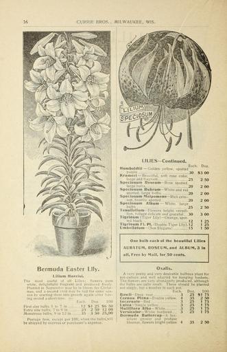 Keywords: Bulbs and plants (16202154229).jpg CURRIE BROS MILWAUKEE WIS <br> LILIES ” Continued <br> Humboldtii ”Golden yellow spotted <br> Purple _ 30 <br> Krameri ” Beautiful soft rose color <br> large and fragrant 25 <br> Speciosum Roseum ” Rose spotted <br> large bulbs 20 <br> Speciosum Rubrum ” White and red <br> spotted large bulbs 20 <br> Speciosum Melpomene ” Rich crim- <br> son heavily spotted 20 <br> Speciosum Album ” White large <br> bulbs 25 <br> Tenuifolium ” Flowers bright vermil- <br> lion foliage delicate and graceful 30 <br> Tigrinum Tiger Lily ” Orange spot- <br> ted black 12 <br> Tigrinum Fl Pi Double Tiger Lily 12 <br> Umbellatum ” See Elegans 15 <br> Doz <br> 3 00 <br> 2 50 <br> 2 00 <br> 2 00 <br> 2 00 <br> 2 50 <br> 3 00 <br> 1 25 <br> 1 25 <br> 1 50 <br> Bermuda Easter Lily <br> Liiium Harrisi <br> The most useful of all Lilies; flowers pure <br> white delightfully fragrant and produced freely <br> Planted in September may be in bloom for Christ- <br> mas and a second crop may be had the same sea- <br> son by starting them into growth again after hav- <br> ing rested a short time ” <br> Each Doz 100 <br> First size bulbs 5 to 7 in 12 1 25 6 50 <br> Extra size bulbs 7 to 9 in 25 2 50 12 00 <br> Monstrous bulbs 9 to 12 in 35 3 50 25 00 <br> Postage free except per 100 when the bulbsj»viil <br> be shipped by express or purchaser's expense <br> One bulb each of the beautiful Lilies <br> AURATUM ROSEUM and ALBUM 3 in <br> all Free by Mail for 50 cents <br> Oxalis <br> A very pretty and very desirable bulbous plant for <br> pot-culture and well adapted for hanging baskets <br> The flowers are very abundantly produced although <br> the bulbs are quite small These should be planted <br> not singly but a number in each pot <br> Each Doz 100 <br> Bowii ” Deep rose 3 25 1 75 <br> Cernua Plena ” Double yellow 4 35 2 50 <br> Incarnato ” Red 3 25 1 75 <br> Lutea ” Single yellow 3 25 175 <br> Multiflora Alba-White 3 25 1 75 <br> Versicolor ” White bordered 3 25 1 75 <br> Bermuda Buttercup ” A lux- <br> uriant grower and profuse <br> bloomer flowers bright yellow 4 35 2 50 42214146 133055 65937 Page 16 Text http //www biodiversitylibrary org/page/42214146 1908 10 5962/bhl title 65937 Currie Brothers Company ; Henry G Gilbert Nursery and Seed Trade Catalog Collection NameFound Cernua NameConfirmed Cernua EOLID 4578743 NameBankID 176392 NameFound Elegans NameConfirmed Elegans NameBankID 5116399 NameFound Liiium NameFound Multiflora NameConfirmed Multiflora Small J M MacDougal Feuillet supersect NameBankID 9260529 NameFound Oxalis NameConfirmed Oxalis sect Pseudobulbosae Norlind EOLID 40270 NameFound Rubrum NameFound Speciosum NameFound Tenuifolium NameFound Tigrinum NameFound Umbellatum Biodiversity Heritage Library Currie Bros Co Bulbs and plants autumn 1901 Garden Stories Bulbs Plants Catalogs Flowers Nurseries Horticulture Plants Ornamental Seeds U S Department of Agriculture National Agricultural Library bhl page 42214146 dc identifier http //biodiversitylibrary org/page/42214146 bhlGardenStories BHLinbloom bulbs plants nurseries horticulture plants ornamental u s department of agriculture national agricultural library bhlgardenstories bhlinbloom Information field Flickr posted date ISOdate 2015-01-28 Check categories 2015 August 24 CC-BY-2 0 BioDivLibrary https //flickr com/photos/61021753 N02/16202154229 2015-08-24 07 56 18 cc-by-2 0 PD-old-70-1923 Currie Bros catalogs Photos uploaded from Flickr by Fæ using a script