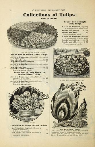 Keywords: Bulbs and plants (16386626041).jpg CURRIE BROS MILWAUKEE WIS <br> Collections of Tulips <br> FOR BEDDING <br> U <br> mmm <br> Round Bed of Single <br> Early Tulips <br> 5 Feet in Diameter requiring <br> 120 bulbs planted 5 inches apart <br> Scarlet and yellow 2 00 <br> Scarlet and white 1 85 <br> Purchaser paying transit <br> 6 Feet in Diameter requiring <br> 170 bulbs planted 5 inches apart <br> Scarlet and yellow 2 80 <br> Scarlet and white 2 50 <br> Purchaser paying transit <br> ROUND BED OF SINGLE TULIPS <br> Round Bed of Double Early Tulips <br> 5 Feet in Diameter requiring 120 bulbs planted <br> 5 inches apart <br> Scarlet and white 2 00 <br> Scarlet and red and yellow 1 75 <br> Purchaser paying transit <br> 6 Feet in Diameter requiring 170 bulbs planted <br> 5 inches apart <br> Scarlet and white 2 80 <br> Scarlet and red and yellow 2 35 <br> Purchaser paying transit <br> Round Bed of Early Single or <br> Double Mixed Tulips <br> 5 Feet in Diameter requiring 120 bulbs <br> planted 5 inches apart S1 00 <br> Purchaser paying transit <br> 6 Feet in Diameter requiring 170 bulbs <br> planted 5 inches apart 1 35 <br> Purchaser paying transit <br> ROUND BED OF DOUBLE TULIPS <br> fee <br> Collection of Tulips for Pot Culture <br> 1 doz Tulips Early Single all different to <br> bloom at same time <br> Delivered free by mail <br> 1 doz Tulips Early Double to bloom at <br> same time <br> Delivered free by mail <br> 35 <br> 35 <br> THE PEACOCK TULIP <br> One of the most attractive Tulips in cultivation <br> Good either for pot or outdoor cultivation <br> Price each 5c; per doz 60c; by mail per 100 <br> 4 50 If wanted by mail add 40c per 100 42214138 133055 65937 Page 8 Text http //www biodiversitylibrary org/page/42214138 1908 10 5962/bhl title 65937 Currie Brothers Company ; Henry G Gilbert Nursery and Seed Trade Catalog Collection Biodiversity Heritage Library Currie Bros Co Bulbs and plants autumn 1901 Garden Stories Bulbs Plants Catalogs Flowers Nurseries Horticulture Plants Ornamental Seeds U S Department of Agriculture National Agricultural Library bhl page 42214138 dc identifier http //biodiversitylibrary org/page/42214138 bhlGardenStories BHLinbloom bulbs plants nurseries horticulture plants ornamental u s department of agriculture national agricultural library bhlgardenstories bhlinbloom Information field Flickr posted date ISOdate 2015-01-28 Check categories 2015 August 24 CC-BY-2 0 BioDivLibrary https //flickr com/photos/61021753 N02/16386626041 2015-08-24 07 52 00 cc-by-2 0 PD-old-70-1923 Currie Bros catalogs Photos uploaded from Flickr by Fæ using a script |
