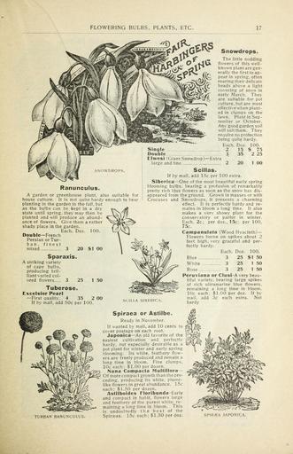 | Keywords: Bulbs and plants (16386640861).jpg FLOWERING BULBS PLANTS ETC <br> 17 <br> \Qg» <br> Ranunculus <br> A garden or greenhouse plant also suitable for <br> house culture It is not quite hardy enough to bear <br> planting in the garden in the fall but <br> as the bulbs can be kept in a dry <br> state until spring they may then be <br> planted and will produce an abund- <br> ance of flowers Give them a rather <br> shady place in the garden <br> Each Doz 100 <br> Double ” French <br> Persian or Tur- <br> ban finest <br> mixed 3 20 1 00 <br> Sparaxis <br> A striking variety <br> of cape bulbs <br> producing bril- <br> liant varied col- <br> ored flowers 3 25 1 50 <br> Tuberose <br> Excelsior Pearl <br> ”First quality 4 35 2 00 <br> If by mail add 50c per 100 <br> Single 2 <br> Double 3 <br> Elwesi Giant Snowdrop ” Extra <br> large and fine 2 <br> Snowdrops <br> The little nodding <br> flowers of this well- <br> known plant are gen- <br> erally the first to ap- <br> pear in spring often <br> rearing their delicate <br> heads above a light <br> covering of snow in <br> early March They <br> are suitable for pot <br> culture but are most <br> effective when plant- <br> ed in clumps on the <br> lawn Plant in Sep- <br> tember or October <br> Any good garden soil <br> will suit them They <br> require no protection <br> being quite hardy <br> Each Doz 100 <br> 15 <br> 35 <br> 75 <br> 2 25 <br> 20 1 00 <br> SCILLA SIBERICA <br> Sciilas <br> If by mail add 15c per 100 extra <br> Siberica ” One of the most beautiful early spring <br> blooming bulbs bearing a profusion of remarkably <br> pretty rich blue flowers as soon as the snow has dis- <br> appeared from the ground Grown in masses or with <br> Crocuses and Snowdrops it presents a charming <br> effect It is perfectly hardy and re- <br> mains in bloom a long time It also <br> makes a very showy plant for the <br> conservatory or parlor in winter <br> Each 2c; per doz 15c per 100 <br> 75c <br> Campanulata Wood Hyacinth ” <br> Flowers borne on spikes about 2 <br> feet high very graceful and per- <br> fectly hardy <br> Each <br> Blue 3 <br> White 3 <br> Rose 3 <br> Peruviana or Clusi-A very beau- <br> tiful variety bearing large spikes <br> of rich ultramarine blue flowers <br> remaining a long time in bloom <br> 10c each; 1 00 per doz If by <br> mail add 3c each extra Not <br> hardy <br> Doz <br> 100 <br> 25 <br> 1 50 <br> 25 <br> 1 50 <br> 25 <br> 1 50 <br> TURBAN RANUNCULUS <br> Spiraea or Astilbe <br> Ready in November <br> If wanted by mail add 10 cents to <br> cover postage on each root <br> Japonica ” An old favorite of the <br> easiest cultivation and perfectly <br> hardy out especially desirable as a <br> pot plant for winter and early spring <br> blooming Its white feathery flow- <br> ers are freely produced and remain a <br> long time in bloom Fine clumps <br> 10c each; 1 00 per dozen <br> Nana Compacta Multiflora ” <br> Of more compact growth than the pre- <br> ceding producing its white plume- <br> like flowers in great abundance 15c <br> each; 1 50 per dozen <br> Astilboides f loribunda-Early <br> and compact in habit flowers large <br> and feather ' of the purest white re- <br> maining a long time in bloom This <br> is undoubtedly the best of the <br> Spiraeas 15c each; 1 50 per doz <br> SpiR/fa japonic \ 42214147 133055 65937 Page 17 Text http //www biodiversitylibrary org/page/42214147 1908 10 5962/bhl title 65937 Currie Brothers Company ; Henry G Gilbert Nursery and Seed Trade Catalog Collection NameFound Astilbe NameConfirmed Astilbe EOLID 11171526 NameBankID 2649623 NameFound Astilboides NameConfirmed Astilboides EOLID 2886988 NameBankID 1812470 NameFound Campanulata NameFound Compacta NameConfirmed Compacta EOLID 10934908 NameBankID 2627020 NameFound Multiflora NameConfirmed Multiflora Small J M MacDougal Feuillet supersect NameBankID 9260529 NameFound Ranunculus NameConfirmed Ranunculus EOLID 37662 NameBankID 2576523 NameFound Scilla siberica NameConfirmed Scilla siberica EOLID 1082428 NameBankID 2669234 NameFound Siberica NameConfirmed Siberica NameBankID 5328274 NameFound Sparaxis NameConfirmed Sparaxis Ker-Gawl EOLID 38091 NameFound Spiraea NameConfirmed Spiraea EOLID 29951 NameBankID 2650385 Biodiversity Heritage Library Currie Bros Co Bulbs and plants autumn 1901 Garden Stories Bulbs Plants Catalogs Flowers Nurseries Horticulture Plants Ornamental Seeds U S Department of Agriculture National Agricultural Library bhl page 42214147 dc identifier http //biodiversitylibrary org/page/42214147 bhlGardenStories BHLinbloom bulbs plants nurseries horticulture plants ornamental u s department of agriculture national agricultural library bhlgardenstories bhlinbloom Information field Flickr posted date ISOdate 2015-01-28 Check categories 2015 August 24 CC-BY-2 0 BioDivLibrary https //flickr com/photos/61021753 N02/16386640861 2015-08-24 07 56 23 cc-by-2 0 PD-old-70-1923 Currie Bros catalogs Photos uploaded from Flickr by Fæ using a script |