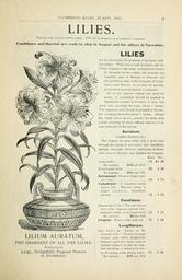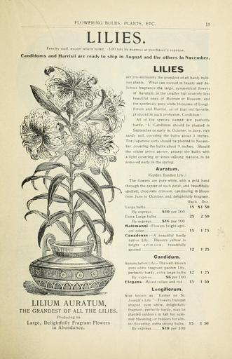 | Keywords: Bulbs and plants (16387458062).jpg FLOWERING BULBS PLANTS ETC <br> 15 <br> LILIES <br> Free by mail except where noted 100 lots by express at purchaser's expense <br> Candidums and Harrisii are ready to ship in August and the others in November <br> LILIUM AURATUM <br> THE GRANDEST OF ALL THE LILIES <br> Producing its <br> Large Delightfully Fragrant Flowers <br> in Abundance <br> LILIES <br> are pre-eminently the grandest of all hardy bulb- <br> ous plants What can exceed in beauty and de- <br> licious fragrance the large symmetrical flowers <br> of Auratum or the smaller but scarcely less <br> beautiful ones of Rubrum or Roseum and <br> the spotlessly pure white blossoms of Longi- <br> florum and Harrisi or of that old favorite <br> produced in such profusion Candidum <br> All of the species named are perfectly <br> hardy L Candidum should be planted in <br> September or early in October in deep rich <br> sandy soil covering the bulbs about 3 inches <br> The Japanese sorts should be planted in Novem- <br> ber covering the bulbs about 9 inches Should <br> the winter prove severe protect the bulbs with <br> a light covering of straw or Iong manure to be <br> removed early in the spring <br> Auratum <br> Golden Banded Lily <br> The flowers are pure white with a gold band <br> through the center of each petal and beautifully- <br> spotted chocolate crimson continuing in bloom <br> from June to October and delightfully fragrant <br> Each Doz <br> Large bulbs 15 150 <br> By express 10 per 100 <br> Extra Large bulbs 25 2 50 <br> By express 16 per 100 <br> Bafemanni Flowers bright apri- <br> cot color 15 1 75 <br> Canadense A beautiful hardy <br> native Lily Flowers yellow to <br> bright crimson beautifully <br> spotted 12 1 25 <br> Candidum <br> Annunciation Lily The well-known <br> pure white fragrant garden Lily <br> perfectly hardy extra large bulbs 12 1 25 <br> By express 6 per 100 <br> Elegans Mixed yellow and red 15 1 50 <br> Longiflorum <br> Also known as Easter or St <br> Joseph's Lily Flowers trumpet <br> shaped pure white delightfully <br> fragrant perfectly hardy may be <br> planted outdoors in fall for sum- <br> mer blooming or indoors for win- <br> ter flowering extra strong bulbs 15 1 50 <br> By express 10 per 100 42214145 133055 65937 Page 15 Text http //www biodiversitylibrary org/page/42214145 1908 10 5962/bhl title 65937 Currie Brothers Company ; Henry G Gilbert Nursery and Seed Trade Catalog Collection NameFound Auratum NameFound Candidum NameFound Elegans NameConfirmed Elegans NameBankID 5116399 NameFound Lilium auratum NameConfirmed Lilium auratum EOLID 1003309 NameBankID 5416786 NameFound Longiflorum NameFound Rubrum Biodiversity Heritage Library Currie Bros Co Bulbs and plants autumn 1901 Garden Stories Bulbs Plants Catalogs Flowers Nurseries Horticulture Plants Ornamental Seeds U S Department of Agriculture National Agricultural Library bhl page 42214145 dc identifier http //biodiversitylibrary org/page/42214145 bhlGardenStories BHLinbloom bulbs plants nurseries horticulture plants ornamental u s department of agriculture national agricultural library bhlgardenstories bhlinbloom Information field Flickr posted date ISOdate 2015-01-28 Check categories 2015 August 24 CC-BY-2 0 BioDivLibrary https //flickr com/photos/61021753 N02/16387458062 2015-08-24 07 56 30 cc-by-2 0 PD-old-70-1923 Currie Bros catalogs Photos uploaded from Flickr by FĂŚ using a script |