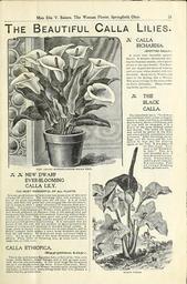 MAKE A MEME View Large Image Bulbs roses plants of all kinds for winter blooming (15775821183).jpg Miss Ella V Baines The Woman Florist Springfield Ohio <br> 21 <br> The Beautiful Calla Lilie <br> \ X CALLA <br> NEW DWARF EVER-BLOOMING CALLA LILY <br> X X NEW DWARF ...