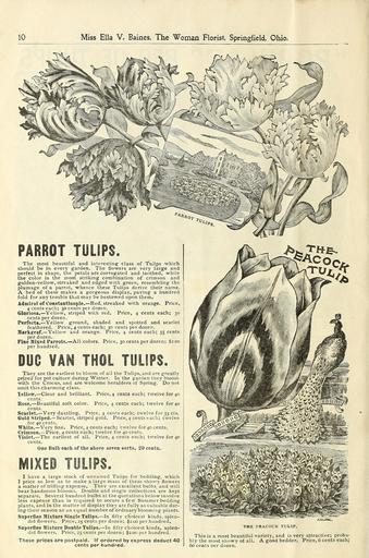 | Keywords: Bulbs roses plants of all kinds for winter blooming (16208415670).jpg 10 <br> Miss Ella V Baines The Woman Florist Springfield Ohio <br> PARROT TULIPS <br> The most beautiful and interesting class of TVilips which <br> should be in every garden The flowers are very large and <br> perfect in shape the petals are corrugated and toothed while <br> the color is the most striking combination of crimson and <br> golden-yellow streaked and edged with green resembling the <br> plumage of a parrot whence these Tulips derive their name <br> A bed of these makes a gorgeous display paying a hundred <br> fold for any trouble that may be bestowed upon them <br> Admiral of Constantinople Red streaked with orange Price <br> 4 cents each; 30 cents per dozen <br> Gloriosa Yellow striped with red Price 4 cents each; 30 <br> cents per dozen <br> Perfects Yellow ground shaded and spotted and scarlet <br> feathered Price 4 cents each; 30 cents per dozen <br> Markgraf Yellow and orange Price 4 cents each; 35 cents <br> per dozen <br> Fine Mixed Parrots All colors Price 30 cents per dozen; 200 <br> per hundred <br> DUG VAN THQL TULIPS <br> They are the earliest to bloom of all the Tulips and are greatly <br> prized for pot culture during Winter In the garden they bloom <br> with the Crocus and are welcome heralders of Spring Do not <br> omit this charming class <br> Yellow Clear and brilliant Price 4 cents each; twelve for 40 <br> cents <br> Rose Beautiful soft color Price 4 cents each; twelve for 40 <br> cents <br> Scarlet Very dazzling Price 4 cents each; twelve for 35 cts <br> Gold Striped Scarlet striped gold Price 4 cents each; twelve <br> for 40 cents <br> White Very fine Price 4 cents each; twelve for 40 cents <br> Crimson Price cents each; twelve for 40 cents <br> Violet The earliest of all Price 4 cents each; twelve for 40 <br> cents <br> One Bnlb each of the above seven sorts 20 cents <br> I have a large stock of unnamed Tulips for bedding which <br> I price so low as to make a large mass of these showy flowers <br> a matter of trifling expense They are excellent bulbs and will <br> bear handsome blooms Double and single collections are kept <br> separate Several hundred bulbs at the quotations below involve <br> less expense than is required to secure a few Summer bedding <br> plants and in the matter of display they are fully as valuable dur- <br> ing their season as an equal number of ordinary blooming plants <br> Superfine Mixture Single Tulips In fifty choicest kinds splen- <br> did flowers Price 25 cents per dozen; 2 00 per hundred <br> Superfine Mixture Double Tulips In fifty choicest kinds splen- <br> did flowers Price 25 cents per dozen; 2 00 per hundred <br> These prices are postpaid If ordered by express deduct 40 <br> cents per hundred <br> THE PEACOCK TULIP <br> This is a most beautiful variety and is very attractive; proba- <br> bly the most showy ot all A good bedder Price 6 cents each; <br> 60 cents ner dozen 41881518 131173 64737 Page 10 Text http //www biodiversitylibrary org/page/41881518 1897 10 5962/bhl title 64737 Ella V Baines Firm ; Henry G Gilbert Nursery and Seed Trade Catalog Collection NameFound Gloriosa NameConfirmed Gloriosa EOLID 33237 NameBankID 2665167 Biodiversity Heritage Library Bulbs roses plants of all kinds for winter blooming all the very best and choicest varieties 1897 Garden Stories Bulbs Plants Catalogs Flowers Plants Ornamental Seed industry and trade Seeds Trade catalogs U S Department of Agriculture National Agricultural Library bhl page 41881518 dc identifier http //biodiversitylibrary org/page/41881518 bhlGardenStories BHLinbloom bulbs plants plants ornamental u s department of agriculture national agricultural library bhlgardenstories bhlinbloom Information field Flickr posted date ISOdate 2015-01-29 CC-BY-2 0 BioDivLibrary https //flickr com/photos/61021753 N02/16208415670 2015-08-24 06 54 30 cc-by-2 0 PD-old-70-1923 Bulbs roses plants of all kinds for winter blooming Photos uploaded from Flickr by Fæ using a script |