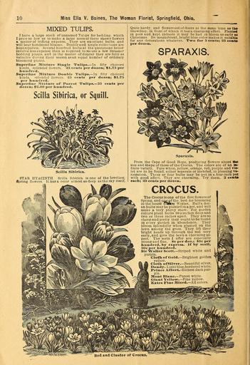 | Keywords: Bulbs, roses, plants of all kinds for winter blooming (15963066093).jpg 10 <br> Miss Ella V Baines The Woman Florist Springfield Ohio <br> MIXED TULIPS <br> I have a large stock of unnamed Tulips for bedding which <br> I price so low as to make a large mass ol these showy flowers <br> a matter of trifling expense They are excellent bulbs and <br> will bear handsome blooms Double and single colled ions are <br> keptseparate Several hundred bulbsat the quotations below <br> involve less expense than is required to secure a few Summer <br> bedding plants and in the matter of display they are fully a3 <br> valuable during their season as an equal number of ordinary <br> blooming plants <br> Superfine Mixture Single Tulips In fifty choicest <br> kinds splendid flowers 25 cents per dozen; 1 75 per <br> hundred <br> Superfine Mixture Double Tnllps In fifty choicest <br> kinds splendid llowers 23 cents per dozen; 1 75 <br> per bnndred <br> Superfine Mixture of Parrot Tulips 35 cents per <br> dozen; 2 00 per hundred <br> Scilla Sibirica or Squill <br> Scilla Sibirica <br> STAR HYACINTH Scilla Sibirica is one of the loveliest <br> Spring flowers It has a color almost as deep as the sky itself <br> Quite hardy and flowers out of doors at the same time as the <br> Snowdrop in front of which it has a charming effect Planted <br> in pots and kept indoors it may be had in bloom as early as <br> Christmas Its magnificent bright blue color makes it suitable <br> for any decorations whatever Two for 5 cents; 25 cents <br> per dozen <br> SPARAXIS <br> Sparaxis <br> From the Cape of Good Hope producing flowers about Itae <br> size and shape of those of the Crocus The colors are of an IB- <br> finite variety Pure white yellow orange red purple and Yie- <br> let are to be found either separate or blended in pleasing va - <br> riegation Three or four bulbs may be put in a four-inch pot <br> with good effect They are charming Try them 3 cento <br> each; 25 cents per dozen <br> CROCUS <br> The Crocus is one of the first flowers of <br> Spring and oneof the best for blooming <br> in the house aHug Winter Haifa doz- <br> en bulbs may be planted in a pot and will <br> make a very pretty show For garden <br> culture plant bulbs two inches deep and <br> two or three inches apart They are so <br> cheap and pretty they ought to be found <br> in every garden in abundance They <br> bloom splendidly when planted on the <br> lawn among the grass They lift their <br> bright heads up through the sod very <br> early and give the lawn a charming as- <br> pect The sorts I offer are especially <br> strong and fine 8c per doz ; 40c per <br> hundred by express If by mail <br> 50c per hundred <br> Sir Walter Scott Striped white and <br> purple <br> Cloth of Gold -Brightest golden <br> yellow <br> Cloth of Silver Beautiful silver <br> Dandy -Light blue bordered white <br> Prince Albert -Richest dark pur- <br> ple <br> Mont Blanc Purest white <br> Giant Yellow Fine yellow <br> Extra Fine Mixed All colors <br> Bed and Cluster of Croctis 41846873 130959 64576 Page 10 Text http //www biodiversitylibrary org/page/41846873 1901 10 5962/bhl title 64576 Ella V Baines Firm ; Henry G Gilbert Nursery and Seed Trade Catalog Collection NameFound Scilla NameConfirmed Scilla L EOLID 33607 NameFound Sibirica NameConfirmed Sibirica NameBankID 5108068 NameFound Sparaxis NameConfirmed Sparaxis Ker-Gawl EOLID 38091 Biodiversity Heritage Library Bulbs roses plants of all kinds for winter blooming 1901 Garden Stories Bulbs Plants Catalogs Flowers Plants Ornamental Seed industry and trade Seeds Trade catalogs U S Department of Agriculture National Agricultural Library bhl page 41846873 dc identifier http //biodiversitylibrary org/page/41846873 bhlGardenStories Miss Ella V Baines Crocus BHLinbloom bulbs plants plants ornamental u s department of agriculture national agricultural library bhlgardenstories miss ella v baines bhlinbloom Information field Flickr posted date ISOdate 2015-02-19 CC-BY-2 0 BioDivLibrary https //flickr com/photos/61021753 N02/15963066093 2015-08-24 02 52 13 cc-by-2 0 PD-old-70-1923 Bulbs roses plants of all kinds for winter blooming Photos uploaded from Flickr by FĂŚ using a script |