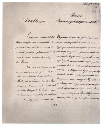 | Keywords: Bulgarian Macedonian Memorandum to the Great Powers 1878 01.jpg Апел на македонските бълга и към Великите сили за п исъединяване към Бълга ия Ст аница 1 Текст в о игинал Ваше Высокоп евозходителство Познаты с Unicode ѫ вече на ц лъ св ть веков- ныте ст аданiя и м ѫ кы на които беззащитно б ха изложены х истiяны- те подъ ту ското фанатическо го- сподство Познато е с ѫ що че адскыте изтязанiя които особено п ет ьп въ посл дн в ме ми олюбивiя блъга скiй на одъ отъ ту ското безп им но ва - ва ство по всето п ост анство на бащиното му огнище въ iзiя Т акiя и акедонiя подигнаха общо негодова- нiе въ об азованый ев опейскый св тъ и найпосл извика Руско-Ту ската война която недавно п стана по Memorandum of the Macedonian Bulgarian Municipalities to the Great Powers for unification with Bulgaria Page 1 Scanned from History of Bulgaria Bulgarian Academy of Sciences Исто ия на Бълга ия Том 7 Бълга ия 1878 - 1903 Издателство на БА София 1991 ст 400 1878-05-20 Bulgarian Municipalities in Macedonia File Bulgarian Macedonian Memorandum to the Great Powers 1878 02 jpg File Bulgarian Macedonian Memorandum to the Great Powers 1878 03 jpg File Bulgarian Macedonian Memorandum to the Great Powers 1878 04 jpg PD-old Historical documents of Bulgaria History of the Republic of Macedonia Congress of Berlin |