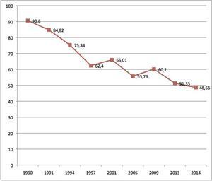 | Keywords: Bulgarian parliamentary elections turnout.png en Bulgarian parliamentary elections turnout chart bg Диаг ама на изби ателната активност на избо ите за а одно съб ание own Лъчеза 2013-05-22 Показано е изменението на изби ателната активност в на всички избо и за а одно съб ание в Бълга ия от 1990 до 2013 г Elections in Bulgaria |