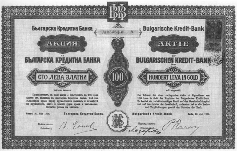 Keywords: Bulgarska kreditna banka share.jpg Акция на Бълга ска к едитна банка Ав амов Румен Комуналният капитализъм Т II София Фондация Бълга ска наука и култу а / Центъ за либе ални ст атегии 2007 ISBN 978-954-90758-8-5 с 445 1918 Author Anonymous-EU Former banks in Sofia Stock certificates of banks in Bulgaria Revenue stamps of Bulgaria Revenue stamps on documents |