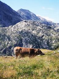 Keywords: bull cow brown standing alpine pasture grass green mountain pyrenees spain landscape