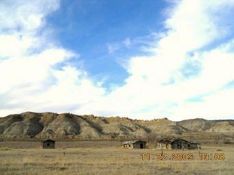 | Keywords: BullBottoms-11.22 09.JPG en Homestead Buildings Bull Creek Bottoms Missouri Breaks Montana own all rights released montana geogaphical society 2009-11-22 Permission is granted to copy distribute and/or modify this document under the terms of the GNU Free Documentation License The three buildings are remnants of homestead buildings at Bull Creek Bottom adjacent to Cow Creek Bottom in the Missouri Breaks of Montana Bull Creek Bottom is about 21 to 22 miles above the Fred Robinson Bridge on the Missouri where U S Highway 161 crosses the Missouri River in the breaks and about 25 miles northeast of Winifred MT The view is looking south down to the mouth of Bull Creek toward the Missouri River which runs along the base of the bluffs in the distance Cow Island is located at this point in the Missouri The homestead is located in an isolated remote portion of the Missouri Breaks in Montana The breaks are so named because of the rough badland-type terrain extending out on either side of the Missouri River for over a hundred miles The area is mostly traversed by dirt roads which literally become impassible when wet because the soil in this area contain bentonite which causes mud to cake up around the wheels of any vehicle Cow Creek Montana Upper Missouri River Breaks National Monument |