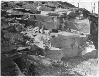 | Keywords: Bulletin 426 Plate IV B Guilford and Waltersville Granite Company Quarry.jpg Granite Maryland and the rock is now called the Woodstock Quartz Monzonite Photo c 1910 <br>Text from the volume referring to this figure <br> The horizontal joints prominent in all the larger quarries separate the granite into sheetlike masses which usually have their strongest development near the surface but in some quarries extend to the entire depth of working Nowhere is this better shown among the Maryland granites than in the old Guilford and Waltersville Granite Company's quarry in the Woodstock area Pls IV B; VI B The sheets may vary from a few inches in thickness at or near the surface to 2 to 10 feet at some distance below the surface In the quarries on the Baltimore County side of Patapsco River at Ellicott City sheeting extends to the depth of working more than 90 feet and the sheets range in thickness from 2 to 4 feet In the quarries of the Woodstock area the sheets are from 2 to 6 feet thick and in the quarries of the Guilford area from 3 to 10 feet thick Approximately the same range in thickness is shown in the Port Deposit quarries one of which has been worked to the extreme depth of 230 feet 1910 Granites of the Southeastern Atlantic States Bulletin 426 United States Geological Survey Government Printing Office Washington 1910 Watson Thomas Leonard other versions PD-USGov Geology Granite Maryland Quarrying |