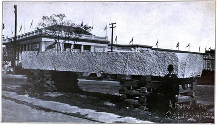 | Keywords: Bulletin 426 Plate XX Granite Monolith.jpg Mount Airy Surry County NC <br>Text from the volume describing this figure <br>The North Carolina Granite Corporation is adequately equipped with all necessary modern machinery and appliances for quarrying and handling the stone In 1905 a large stone-cutting plant was erected The stone is carried from the quarries to the railway cars by a system of inclined cableways run by gravity The limit in size of dimension stone is the capacity of the railroad cars Blocks weighing 20 tons are reported to have been frequently shipped from the quarries See Pl XX 1910 Granites of the Southeastern Atlantic States Bulletin 426 United States Geological Survey Government Printing Office Washington 1910 Watson Thomas Leonard other versions PD-USGov Geology Quarrying |
