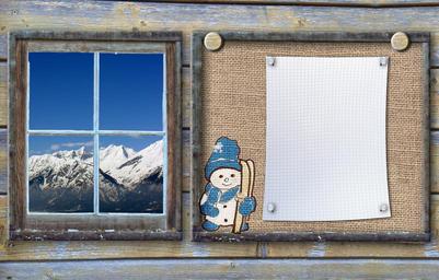 Keywords: bulletin board winter sports snow man wood blue background list mountains window ski
