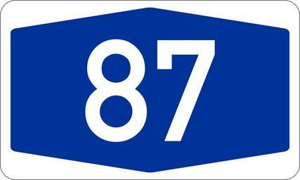 | Keywords: Bundesautobahn 87 number.svg Bundesdeutsche Autobahnnummer Automatisch erzeugt durch 3247 Anmerkung Diese Autobahn existiert nicht war oder ist jedoch geplant Dieses Bild wurde für die Nutzung in Artikeln über die Planung erstellt German Autobahn number signet Created automatically by 3247 Note This road does not currently exist but is or was planned The number sign is supposed to be used in articles about the planned road Bundesautobahn numbers 087 87 number | ||||
