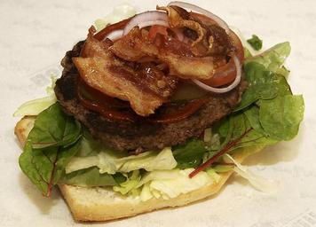 Keywords: burger cooking provisioning dining taste food onion salad tastes bacon crispy fried bread under the bun tomato ketchup