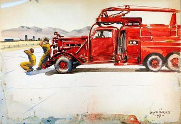 | Keywords: art watercolor airplane john w. burgess johnwburgess san diego air and space museum sandiegoairandspacemuseum outdoor Artist: John W. Burgess Airplane:Fire Truck Add. Info:"Fire Trucks, Secret Jet N. Base 1945." Year: 1945 Repository: San Diego Air and Space Museum Archive Artist: John W. Burgess Airplane:Fire Truck Add. Info:"Fire Trucks, Secret Jet N. Base 1945." Year: 1945 Repository: San Diego Air and Space Museum Archive | ||||