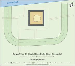 | Keywords: Burgus Solva 21 – Dömös-Kövespatak.svg de Burgus Solva 21 “ Dömös-Kövespatak Der römische Wachturm wurde 1955 während einer Feldbegehung erstmals entdeckt und konnte 1959 vollständig ergraben werden Quelle Sándor Soproni žDer spätrömische Limes zwischen Esztergom und Szentendre Akadémiai Kiadó Budapest 1978 S 49 “50 Nr 19 Taf 51 1 Die dort wiedergegebene Grabungsskizze wurde mit den aus der Beschreibung bekannten Aufmaßen überarbeitet own Mediatus 2015-06-14 v Cc-zero Limes Pannonicus |