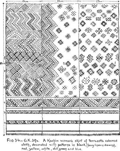 | Keywords: Burmese Textiles Fig34.png en A Figure from the booklet Burmese textiles Fig 34 -G K 39a A Kachin Woman's skirt of terracotta coloured cloth decorated with patterns in black heavy lines in drawing red yellow white dull green and blue Burmese Textiles from the Shan and Kachin districts Laura E Start 1917-03 PD PD-Art Burmese Textiles |