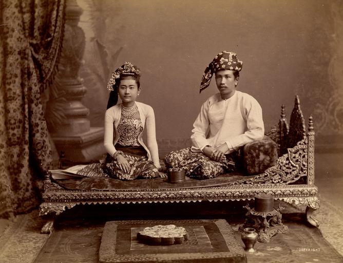 MAKE A MEME View Large Image Burmese upper class couple.jpg en Photograph of a Burmese upper class couple Burma Myanmar probably taken by Philip Adolphe Klier in the 1890s In this full-length studio portrait the man and woman are shown seated on a carved wooden couch ...