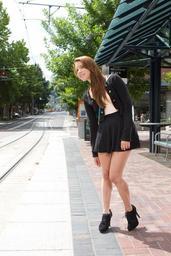 Keywords: bus stop bus public transport urban waiting looking teen girl skirt