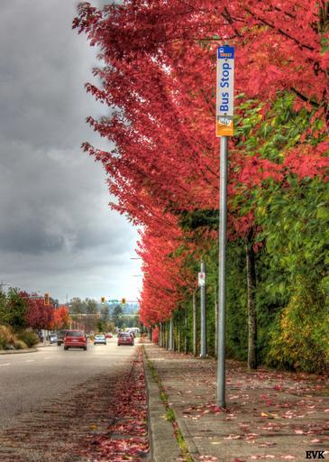 Keywords: bus stop road waiting street trees blossoms fallen pavement scenery urban