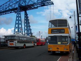 | Keywords: Buses in Ferry Road, 2012 Teeside Running Day (2).jpg Middlesbrough Transporter Bridge on the day of the 2012 Teeside Running Day This is the south end of the bridge viewed from the south west The road in the foreground is Ferry Road whose east-west portion pictured here was being used as the staging area for the event see the rally categories for further operational/location details Ferry Road is the bridge approach road curving around to the north in the distance to meet the cradle Three preserved buses are in shot they are from left to right Wallace Arnold reg VUB 396H United BG413 reg LHN 860 Tyne and Wear PTE 413 reg JFT 413X own 2012-04-22 Ultra7 2012 Teeside Running Day Middlesbrough Transporter Bridge |