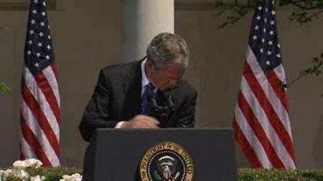 | Keywords: Bush Bird Poop 2.png Image Screen shot Image 2 of 4 of United States President George W Bush wipes off bird feces with his bare hand during a press conference on May 24 2007 in the White House Rose Garden Bush was addressing the American press in the White House's Rose Garden The incident occurred just as Bush said I've got confidence in Al Gonzales doin' the job referring to a question asked by a reporter about the controversial dismissal of several U S attorneys Source http //www whitehouse gov/news/releases/2007/05/20070524 html <br /> Direct link to video http //mfile akamai com/5913/wmv/whitehouse download akamai com/5913/2007/05/20070524 v asx obj 2 must download/open link into a player such as VideoLAN PD-USGov George W Bush in 2007 West Colonnade White House W |