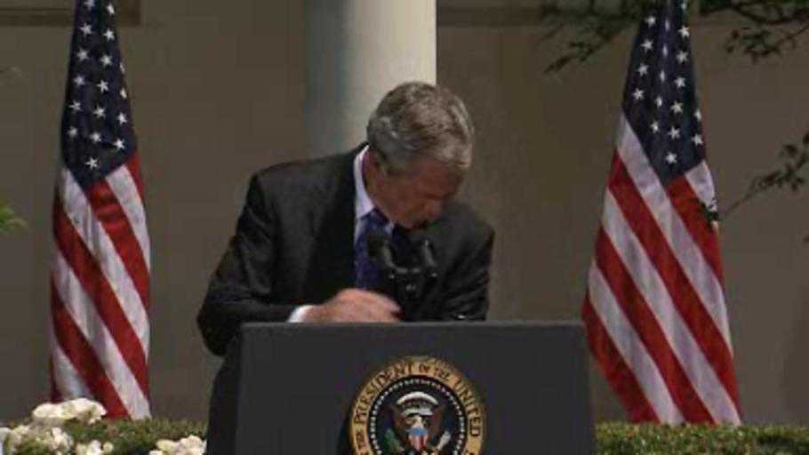 Keywords: Bush Bird Poop 2.png Image Screen shot Image 2 of 4 of United States President George W Bush wipes off bird feces with his bare hand during a press conference on May 24 2007 in the White House Rose Garden Bush was addressing the American press in the White House's Rose Garden The incident occurred just as Bush said I've got confidence in Al Gonzales doin' the job referring to a question asked by a reporter about the controversial dismissal of several U S attorneys Source http //www whitehouse gov/news/releases/2007/05/20070524 html <br /> Direct link to video http //mfile akamai com/5913/wmv/whitehouse download akamai com/5913/2007/05/20070524 v asx obj 2 must download/open link into a player such as VideoLAN PD-USGov George W Bush in 2007 West Colonnade White House W |