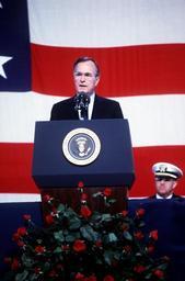 | Keywords: BushIowaCeremony.jpg President George H W Bush speaks during a memorial service for 47 crew members killed in an explosion aboard the battleship USS Iowa BB-61 The explosion occurred in the No 2 16-inch gun turret as the Iowa was conducting routine gunnery exercises approximately 300 miles northeast of Puerto Rico on April 19th Released to Public Location NAVAL STATION NORFOLK VIRGINIA VA UNITED STATES OF AMERICA USA DoD photo by PH1 AC SCOTT ALLEN Date Shot 1 Apr 1989 Source http //www defenselink mil/multimedia/ PD-USGov-Military-Navy George H W Bush People with flags of the United States |