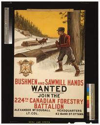 | Keywords: Bushmen and Sawmill Hands Wanted. Join the 224th Canadian Forestry Battalion WDL282.png Artwork ru Т ебуются лесо убы и абочие для лесопилки П исоединяйтесь к 224-му Канадскому лесному батальону fr Bushmen et Sawmill Hands Recherchés Rejoignez le 224ème Bataillon canadien de foresterie en Bushmen and Sawmill Hands Wanted Join the 224th Canadian Forestry Battalion zh 要增添林业人手与锯 参加第224支加拿大林业区部队 pt Procura-se trabalhadores de floresta e serraria Junte-se ao 24º Batalhão Florestal Canadense ar مطلوب رجال غاب وعمال منشرة انضموا إلى الكتيبة 224 الكندية للغابات ru В годы Пе вой ми овой войны все участвовавшие в ней ст аны использовали плакаты как с едство мобилизации усилий своего населения нап авленных на выполнение военных задач ст аны Плакат об ащен к опытным лесо убам и аботникам лесопилок с п изывом вступить доб овольцами в новую воинскую часть фо ми ующуюся в Канаде В 1916 году п авительство Великоб итании об атилось к п авительству Канады с п осьбой сфо ми овать особый лесной батальон для службы в Великоб итании и Ф анции где наблюдалась нехватка специалистов с опытом аботы в лесной п омышленности За шесть недель в эту воинскую часть были наб аны более 1600 доб овольцев Им было по учено асчищать те ито ии для ст оительства аэ од омов изготовлять железнодо ожные шпалы и заготавливать д евесину для ук епления т аншей и окопов а также ст оительства ба аков и госпиталей <br>Канада Канадская а мия; Леса и лесное хозяйство; Салазки и сани; Плакаты военного в емени; Лесозаготовка; Пе вая ми овая война 1914-1918 гг fr Durant la Première guerre mondiale toutes les parties ont utilisé des affiches comme outils pour mobiliser leurs populations en faveur de l'effort de guerre Cette affiche par un artiste inconnu lance un appel aux hommes avec une expérience de l'exploitation forestière et des scieries à se joindre à une nouvelle unité militaire en cours de formation au Canada En 1916 le gouvernement britannique a demandé au gouvernement du Canada de recruter un bataillon forestier spécialisé pour servir en Grande-Bretagne et en France où manquaient des capacités forestières En un délai de six semaines plus de 1 600 hommes ont été recrutés dans l'unité à qui ont été assignées des tâches telles que le défrichage de sites pour construire des terrains d'aviation la fabrication de traverses de chemin de fer ainsi que la production de bois d'oeuvre pour le renforcement des tranchées et la construction de casernes et d'hôpitaux <br>Canada Armée canadienne; Forêts et foresterie; Luges et traîneaux; Affiches de guerre; Coupe du bois; Guerre mondiale 1914-1918 en In World War I all sides used posters as tools to mobilize their populations for the war effort This poster by an unknown artist appeals to men with logging and sawmill experience to join a new military unit being formed in Canada In 1916 the British government asked the government of Canada to recruit a specialized forestry battalion for service in Britain and France where forestry skills were in short supply In a period of six weeks over 1 600 men were recruited for the unit which was assigned such tasks as clearing sites to build airfields manufacturing railroad ties and producing lumber to shore up trenches and build barracks and hospitals <br>Canada Canadian Army; Forests and forestry; Sleds and sleighs; War posters; Woodcutting; World War 1914-1918 zh 第 次世界大战 间,各方都使用海报 为动员民众的工具 这幅由不明身份画家创 的海报旨 呼吁拥 采伐和锯 经验的男子加入 加拿大新组建的军队 1916 年,英国政 要求加拿大政 招募 支专门的林业部队 英国和法国 役,当时的英国和法国缺乏林业方 的 能 六个星 内,该部队招募新兵 1 600 人,这批军队被指派的任务包括清理建设 的 生产铁路枕 以及生产支撑战壕和建设营房及医院 的 <br>加拿大 加拿大军队; 森林和林业; 雪橇和雪橇; 战争海报; 伐 ; 第 次世界大战,1914-1918 年 pt Na 1ª Guerra Mundial todos os lados utilizavam cartazes como ferramentas para mobilizar as populações para o esforço de guerra Este cartaz de um artista desconhecido faz um apelo aos homens com experiência em exploração madeireira e serralharia para participar de uma nova unidade militar a ser formada no Canadá Em 1916 o governo britânico pediu ao governo do Canadá para recrutar um batalhão especializado em florestamento para servir na Grã-Bretanha e na França onde as aptidões florestais eram escassas Em um período de seis semanas mais de 1600 homens foram recrutados para a unidade à qual foram atribuídas tarefas tais como a limpeza de locais para construir aeródromos fabricação de dormentes ferroviários produção de madeira serrada para montar trincheiras e construir alojamentos e hospitais <br>Canadá Exército canadense; Florestas e silvicultura; Trenós; Cartazes de guerra; Xilografia; Guerra Mundial 1914-1918 ar استخدمت جميع الأطراف في الحرب العالمية الأولى ا