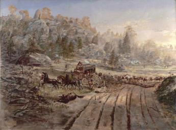 | Keywords: Bushrangers Eugowra Rocks.jpg en Stage coach hold-up Eugowra Rocks oil on canvas 137 5 x 183 cm http //www nla gov au/apps/cdview pi nla pic-an2292684 fullrecord yes Patrick William 1858-1939 1894 PD-Australia Bushrangers in art Escort Rock Paintings in Australia |