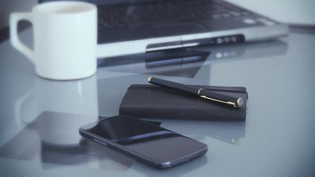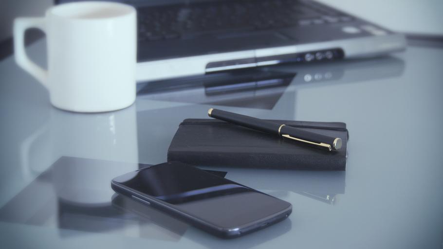 Keywords: business computer laptop in the workplace coffee coffee mug pen notebook office work home office organization mobile phone smartphone