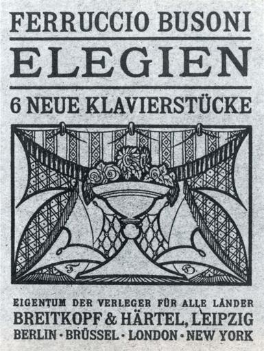 Keywords: Busoni Elegien - cover for the first edition 1908.jpg Elegies a set of piano pieces by Ferruccio Busoni Scan of figure 30 following p 64 in Antony Beaumont 1985 Busoni the Composer London Faber and Faber Incorporates a design by Ferruccio Busoni 1866-1924 Published in 1908 in Germany PD-old Elegies in art Ferruccio Busoni |