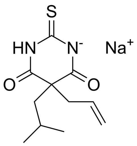 | Keywords: Buthalital sodium.svg Chemical structure of buthalital sodium Bayinal Baytinal Thialbutal Transithal Ulbreval or buthalitone Own 16 41 21 May 2012 UTC Ed Edgar181 150px Barbiturates Thiocarbonyl compounds Sodium salts of organic compounds Allyl compounds Isobutyl compounds |