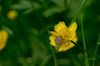 Keywords: buttercup blossom bloom snail mollusk yellow summer meadow macro close nature