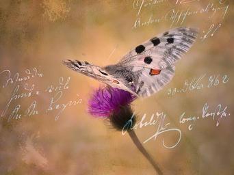 Keywords: butterfly apollo flower blossom bloom font handwriting vintage painting greeting card