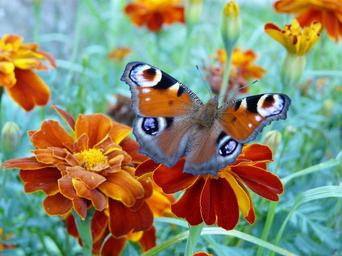 Keywords: butterfly flower orange wings butterfly wings summer color butterfly peacock rusty brown afrikaner brindle antennae insect marigold marigold rozkladitý nature