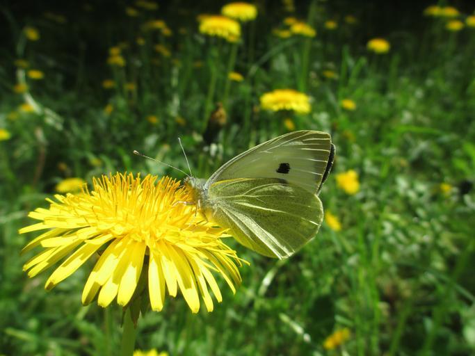 Keywords: butterfly green-veined white insect dandelion white yellow flower nature green meadow wing feeding