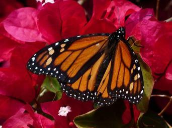 | Keywords: butterfly monarch butterfly danaus plexippus american monarch orange black butterflies edelfalter nymphalidae walking butterfly bougainvillea colorful flowers red intensive color bright bush bougainville triple flower four o'clock plant nyctaginaceae kahle hook flower bougainvillea glabra ornamental plant climber |