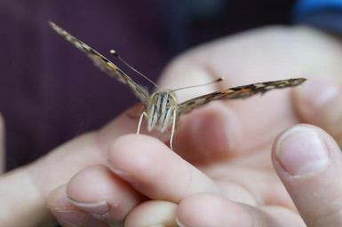 | Keywords: butterfly painted lady close edelfalter insect summer animal fauna butterflies wing child's hand hand protect protection environmental protection child keep leave blank careful carefully freedom responsibility macro frontal from the front spread face |