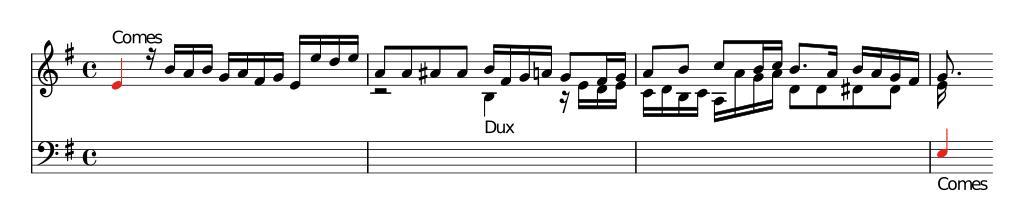 Keywords: BuxWV142-Comes-Dux.svg de Dux und Comes von Fuge BuxWV 142 nach File BuxWV142-Comes-Dux GIF Erstellt mit LilyPond Dux and Comes or leader and follower in BuxWV 142 after File BuxWV142-Comes-Dux GIF Made with LilyPond Source Code <pre> \version 2 10 0 << Violinschlüssel Stimme 1 \clef violin \time 4/4 \key g \major \override NoteHead 'color red \override Stem 'color red e'4 Comes \override NoteHead 'color black \override Stem 'color black r16 b' a' b' g' a' fis' g' e' e d e a'8 a' ais' ais' b'16 fis' g' a' g'8 fis'16 g' \noBreak a'8 b' c b'16 c b'8 a'16 b' a' g' fis'\noBreak g'8 \\ Violinschlüssel Stimme 2 \clef violin \time 4/4 \key g \major s1 r2 b4_ Dux r16 e' d' e' c' d' b c' a a' g' a' d'8 d' dis' dis' e'16 Bassschlüssel \new Staff \clef bass \time 4/4 \key g \major s1 s s \override NoteHead 'color red \override Stem 'color red \stemUp e4_ Comes s4 s4 >> </pre> 2012-05-07 own Christian Stroppel SVG Brian Ammon File BuxWV142-Comes-Dux GIF cc-zero Sheet music of Dieterich Buxtehude Fugues
