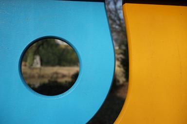 Keywords: by looking see through hole wall wood blue orange