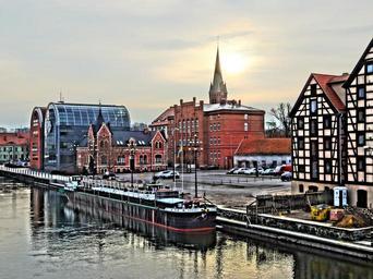 Keywords: bydgoszcz waterfront boats sunrise water urban canal river buildings