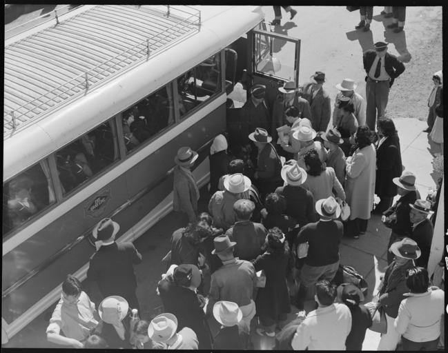 | Keywords: Byron, California. Evacuees of Japanese ancestry boarding a bus for the Turlock Assembly center, si . . . - NARA - 537892.jpg Scope and content The full caption for this photograph reads Byron California Evacuees of Japanese ancestry boarding a bus for the Turlock Assembly center sixty-five miles away Six bus-loads left on this day from this small agricultural town which included highly skilled managers farm owners tenant operators tractor drivers and farm laborers General notes 537892 Local identifier 210-G-C582 Department of the Interior War Relocation Authority 02/16/1944 - 06/30/1946 NARA-Author Lange Dorothea 1895-1965 Photographer 1372774 <br /> Still Picture Records Section Special Media Archives Services Division NWCS-S National Archives at College Park 8601 Adelphi Road College Park MD 20740-6001 1942-05-02 Record group Record Group 210 Records of the War Relocation Authority 1941 - 1989 Record group ARC 537 Central Photographic File of the War Relocation Authority compiled 1942 - 1945 Series ARC 536000 File unit File unit ARC Variant control numbers NAIL Control Number NWDNS-210-G-C582 Other versions <gallery> File Byron _California _Evacuees_of_Japanese_ancestry_boarding_a_bus_for_the_Turlock_Assembly_center _si_ _ _ _-_NARA_-_537892 tif tif File Byron _California _Evacuees_of_Japanese_ancestry_boarding_a_bus_for_the_Turlock_Assembly_center _si_ _ _ _-_NARA_-_537892 jpg jpg </gallery> NARA-cooperation PD-USGov Dorothea Lange Japanese American internment processing in Byron California |