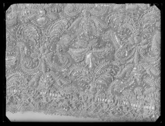 | Keywords: Byxor av guldlamé helt täckt av guldbroderi - Livrustkammaren - 53945.tif LSH artwork sv Dräkten beställdes 1654 från Frankrike genom Magnus Gabriel de la Gardie inför festligheterna vid Karl X Gustavs kröning och efterförljande bröllop Byxor av rak modell De är sydda av 4 egentliga huvudbeståndsdelar som dock försetts med skarvar av något varierande storlek nertill horisontellt för att öka längden samt vertikala ökningstycken framtill vid sprundet och på motsvarande ställen baktill och slutligen nertill vid byxbenens inre sömmar Ursprungsmaterialet är gul filemort oskuren sammet men skarvstyckena är något mörkare med dragning åt rött i färgen Ursprungsmaterialets vådbredd är minst 43 cm 14 rader oskurna öglor på rätan Byxorna har raka sömmar i sidorna och svagt sneddade fram och baksömmar Framtill är ett 34 cm långt sprund När sprundens längd angives i texten inbegripes aldrig linningen med en c a 29 cm lång knäppslå med 12 knapphål knäppslån följer i hela sin längd det iskarvade mörkare stycket framtill Byxorna är något rynkade vid den 127 5 cm långa linningen som också försetts med flera skarvar baktill I denna finns de 2 stora 2 1 cm i diam guldtrådsklädda knapparna kvar De knäpps med de 4 cm långa knapphålen på vänster framsida I linningen finns 7 st silverhakar kvar den främsta på vänster sida som skulle träs genom det lilla tränsade hålet vid urfickan saknas Linningen är gjord av något grövre oskuren sammet Linningsknapparna är av samma typ som den som finns kvar i byxorna till dräkt nr 3418 De 2 stora byxfickorna har 22 5 cm långa vertikala sprund i sidsömmarna Ficksäckarna är av skinn På höger framstycke finns också en mindre ficka med vertikalt sprund 19 cm från framkanten räknat Dessa 3 fickor har stoffering med gul moiré samma sort som också begagnats i fickan på byxlinningen till dräkt nr 3418 Knapphålsslån är på rätan gjord av guldbrokad av samma sort som tröjans foder och av relativt mörk sammet på baksidan De 2 cm långa knapphålen är sydda med 8 stygn/cm av gult högertvinnat silke Ficksprunden och knäppslån samt sprunden vid framkanterna är skodda med kastanjebrunt ripsband 14 inslagstr/cm Mellanfoder finns ej i byxorna men de har innerfoder av ursprungligen vit linnelärft 28x28 tr/cm2 Nedtill kan man i fodret se hål efter stygn ca 3 5 cm från kanten som tyda på att en slå eller skoning varit sydd på insidan Byxorna har garnerats med spets knypplad av guldtråd och med inlagda guldlan - samma typ som på tröjan Analysresultat Metalltråd av förgyllt silver legerat med koppar huvudbeståndsdelar Silver xxxGuld xxKoppar xxxZink 0Numera finns det spets kvar blott nedtill vid benen ca 1 8 cm bred Den är knypplad av ljusgul silkeskärna med högertvinnad guldlan samt 2 bandformiga lan varav en ligger intill spetsens stadkant och en i vinkelböjning lanen är 2 mm bred Förutom av spetsen nertill garneras byxorna av rosetter framtill av vilka de ursprungliga 5 alltjämt finns kvar på varje sida 3 i en övre horisontell rad och 2 därunder Rosetterna består dels av ett 2 5 cm brett metalltrådsband med 2 atlasränder av rött silke ca 18 inslagstr/cm som knutits i 3 öglor varje ögla 16 á 17 cm lång samt dels ett 4 2 cm brett metalltrådsband med bl a mönstervävda ränder i brunt silke 17 inslagstr/cm som också knutits i 3 öglor c a 16 cm i varje ögla Analysresultat band huvudbeståndsdelar Silver xxxGuld 0Koppar xZink 0På byxornas bakstycken finns ett par vertikala uppklipp ca 15 cm långa som sytts ihop På vänster sida framtill i linningen är byxorna på insidan märkta med bläck N 39 i 1789-90 års inv och de är urbrända i jämnhöjd med knapphålsslån ett stycke in i fodret Beträffande broderiets karaktär kan nämnas att de mörkare partierna skarvats om till det ursprungliga plagget har broderats med visserligen samma mönster men mer utdraget glesare och spretigare och samtidigt svulstigare och man har tydligen inte vetat vilka mönsterdetaljer som är huvudsakliga och vilka som är underordnade Sålunda har palmbladskvistarna vanligen 4 kvistar åt resp håll på det ursprungliga broderiet men oftast blott 3 på de mörkare partierna Bladkvistarna har i de nyare - sekundära mörkare styckena blivit lika breda nedtill som upptill vilket också utgör en skillnad mot det ursprungliga broderiet Vidare är bågarna som hålla palmkvistarna mer svängda och har 7 jämnstora kulor över sig Man har dock i de tillskarvade partierna låtit mönstret fortsätta på det mest eleganta sätt Blott i sidsömmarna stämma mönstren numera ej överens men här har ju en spets dolt sömmen Det gamla broderiet verkar därtill gulare I byxornas nederkant fortsätter broderiet i det lilla upp- och invikta stycket Här har man alltså haft en ytterligare marginal att släppa på Broderiet har ej avpassats efter plaggets form med någon avslutande bård eller dylikt nedtill det är helt yttäckande och följer materialets riktning original caption Karl X Gustavs kröning 1654 linen Färg vit d2 - dräkt - foder material linnelärft - velvet Färg gul röd d1 - dräkt - yttermaterial material sammet size mm 127 5 midjemått LRK Karl X Gustav av Sverige Tre Karlar 1984-1985 Sweden - A Royal Treasury 1988-1989 Modelejon 2002 Les arts décoratifs sous Louis XIII 2002 Sweden and Europe 1632-1792 2003-2004 Fest och fritid vid hovet 2003 Livrustkammaren nya basutställning 2018 LRK bas 2018 Livrustkammaren place of origin original filename LN_E04582 67902 inventory number LRK 31309 53945 CC0 Byxor av guldlamé helt täckt av guldbroderi - Livrustkammaren - 53945-negative tif <gallery caption Different images of same object > File Byxor av guldlamé helt täckt av guldbroderi - Livrustkammaren - 11141 tif File Byxor av guldlamé helt täckt av guldbroderi - Livrustkammaren - 79627 tif File Byxor av guldlamé helt täckt av guldbroderi - Livrustkammaren - 45384 ti