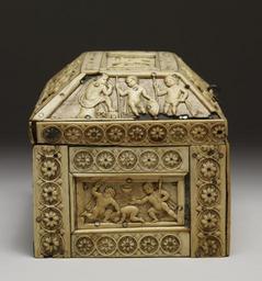 | Keywords: Byzantine - Casket with Images of Cupids - Walters 71298 - Right Side.jpg This finely carved ivory casket is decorated with curly-haired erotes cupids in the guise of warriors dancers and musicians The lid shows two in equestrian combat while the trapezoidal panel in front shows a group of four erotes and a centaur dancing and playing musical instruments The rectangular plaque on the casket's front features an eros playing a harp on a stand a chariot drawn by panthers and two other erotes playing musical instruments century 10 Medieval bone ivory wood cm 12 6 18 5 13 5 accession number 71 298 31653 Bought in Italy Edward Joseph London ca 1888 by purchase Sale Christie's London May 6 1890 no 1003 and February 1894 no 357 Isaac Falcke London 1894 by purchase Sale Christie's London April 19 1910 no 166 Jacques Seligmann Paris 1910 by purchase Henry Walters city Baltimore Walters Art Museum Henry Walters Acquired by Henry Walters 1910 Early Christian and Byzantine Art Baltimore Museum of Art Baltimore 1947 Ivory The Sumptuous Art The Walters Art Gallery Baltimore 1983-1984 The Taste of Maryland Art Collecting in Maryland 1800-1934 The Walters Art Gallery Baltimore 1984 place of origin Constantinople present-day Istanbul Turkey Walters Art Museum license Byzantine ivory in the Walters Art Museum Decorative and applied arts of Byzantine Empire Media contributed by the Walters Art Museum needs category review |